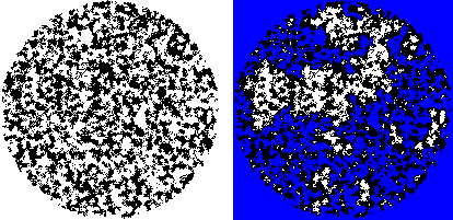A Search for the accessible volume. (left) the occupied cells in black belong to either the adsorbent phase or the adsorbed phase while the unoccupied cells represent the gas phase; (right) a flood fill (blue) is introduced at a point in the exterior of the media. The blue area is the accessible space. Notice the inaccessible blank cells.